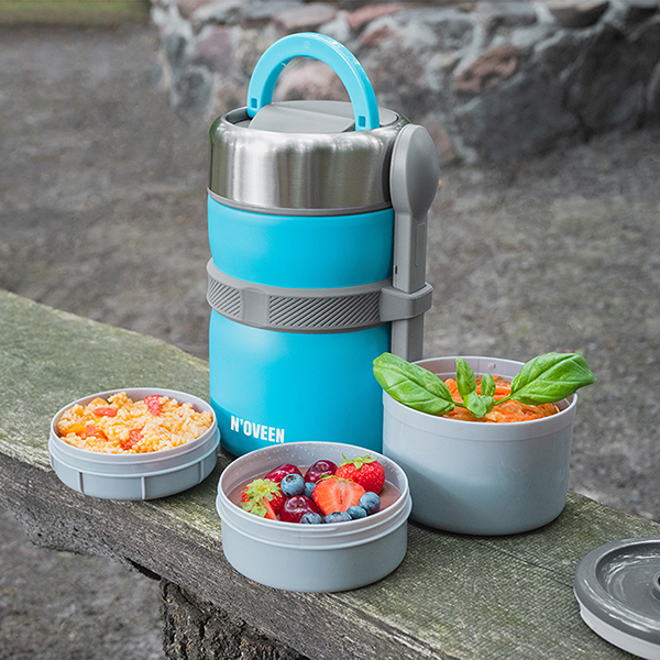 Большой объем на два литра и три пластиковые контейнера позволяют разделить пищу на несколько приемов либо отделить холодное от горячего.